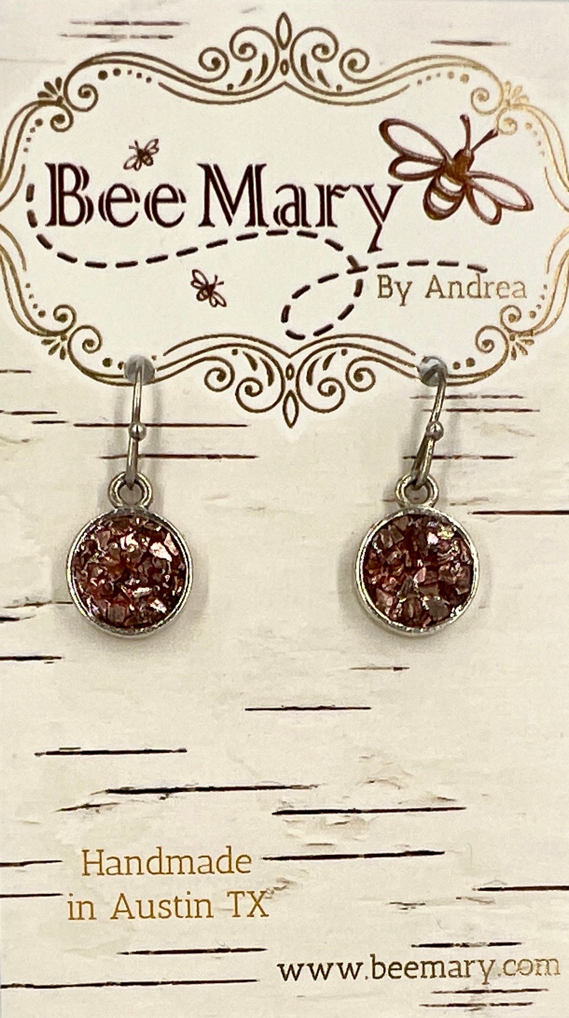 Dots with colorful crushed glass set in resin and hanging on silver plated drop style ear wires.