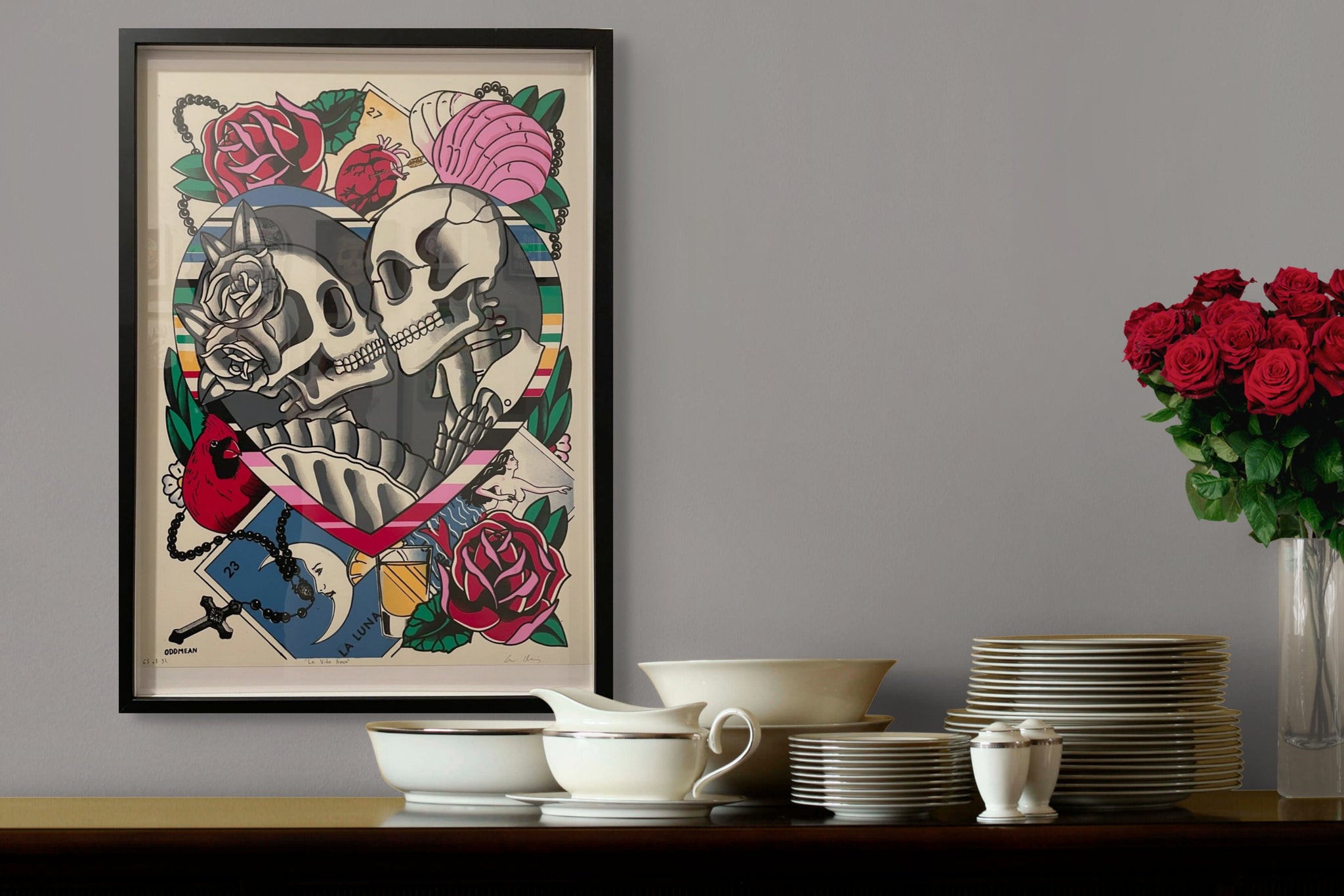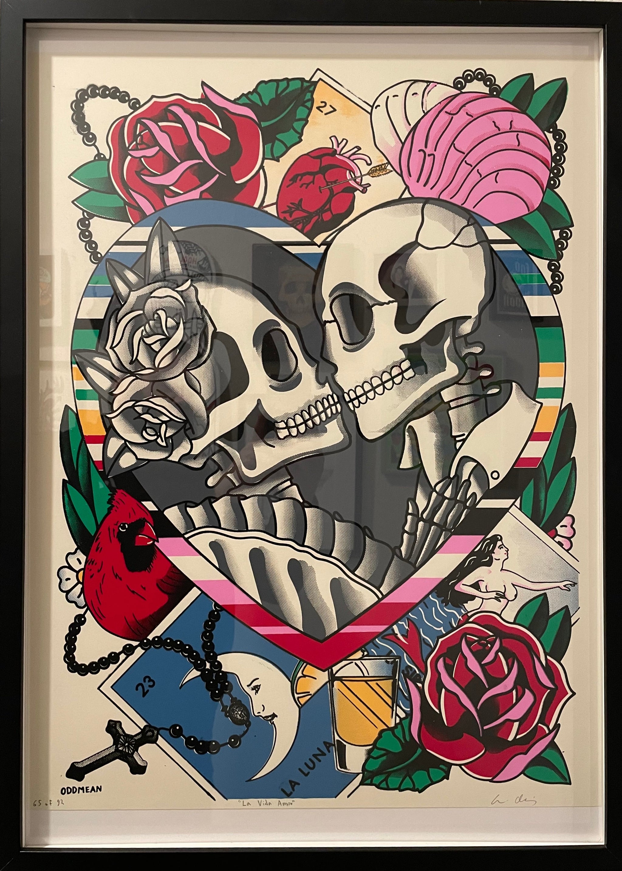Oddmean is the moniker created by South Texas artist Armin Alaniz. Armin is a Mexican American and a generational Texan. His art style was created by his love of skateboarding, tattoo, punk, horror and the Latino Street culture background. Armin grew up reading Thrasher magazine, admiring lowrider artwork, and studying punk rock albums all while living within the backdrop of Corpus Christi and Austin's street art. His work uses graphic style designs with bold black lines, and vibrant colors that skew towards symmetry.