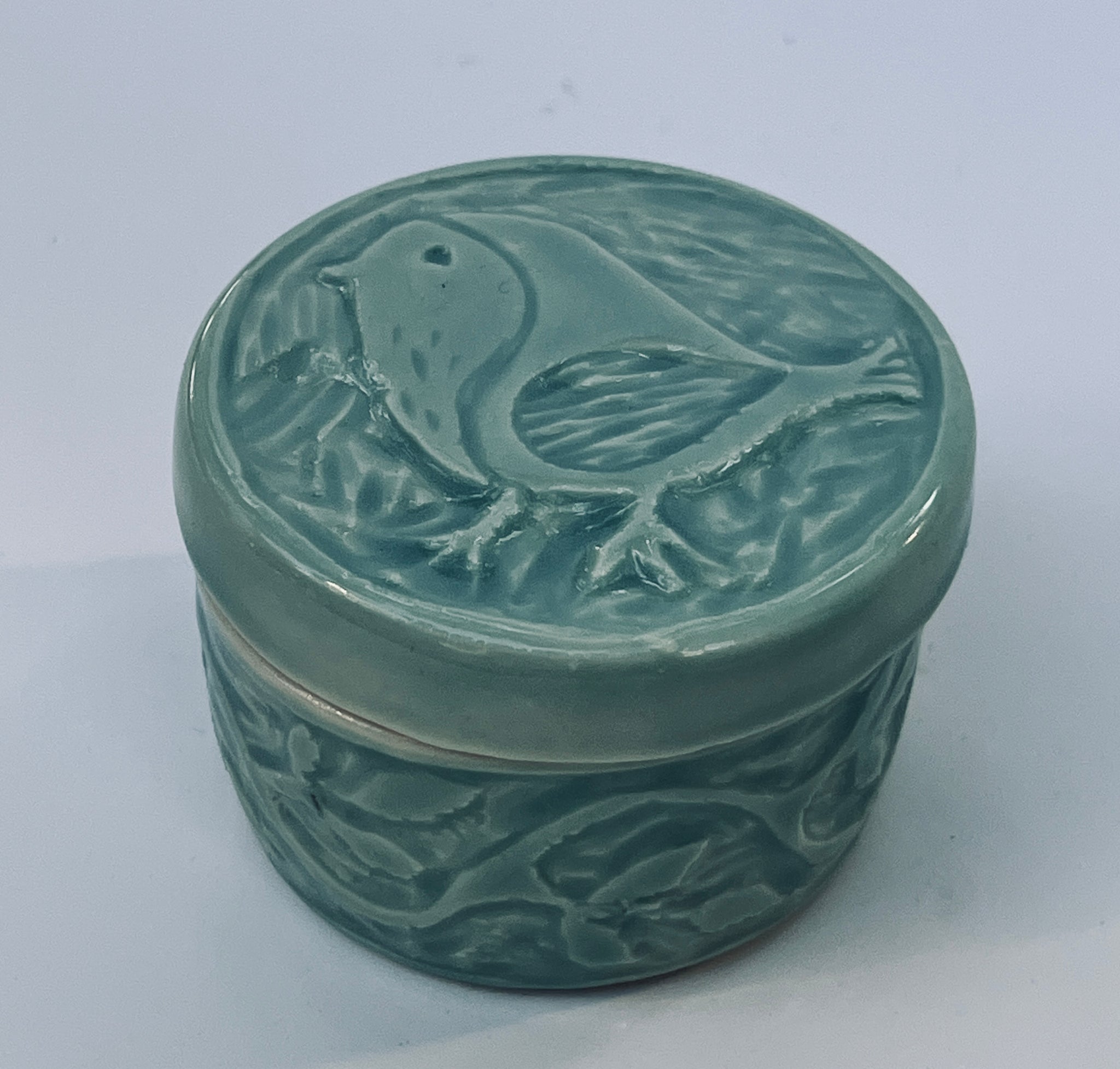 This gorgeous lidded dish is embellished with a bird on the lid and vines around the side! Perfect for all of your little treasures.