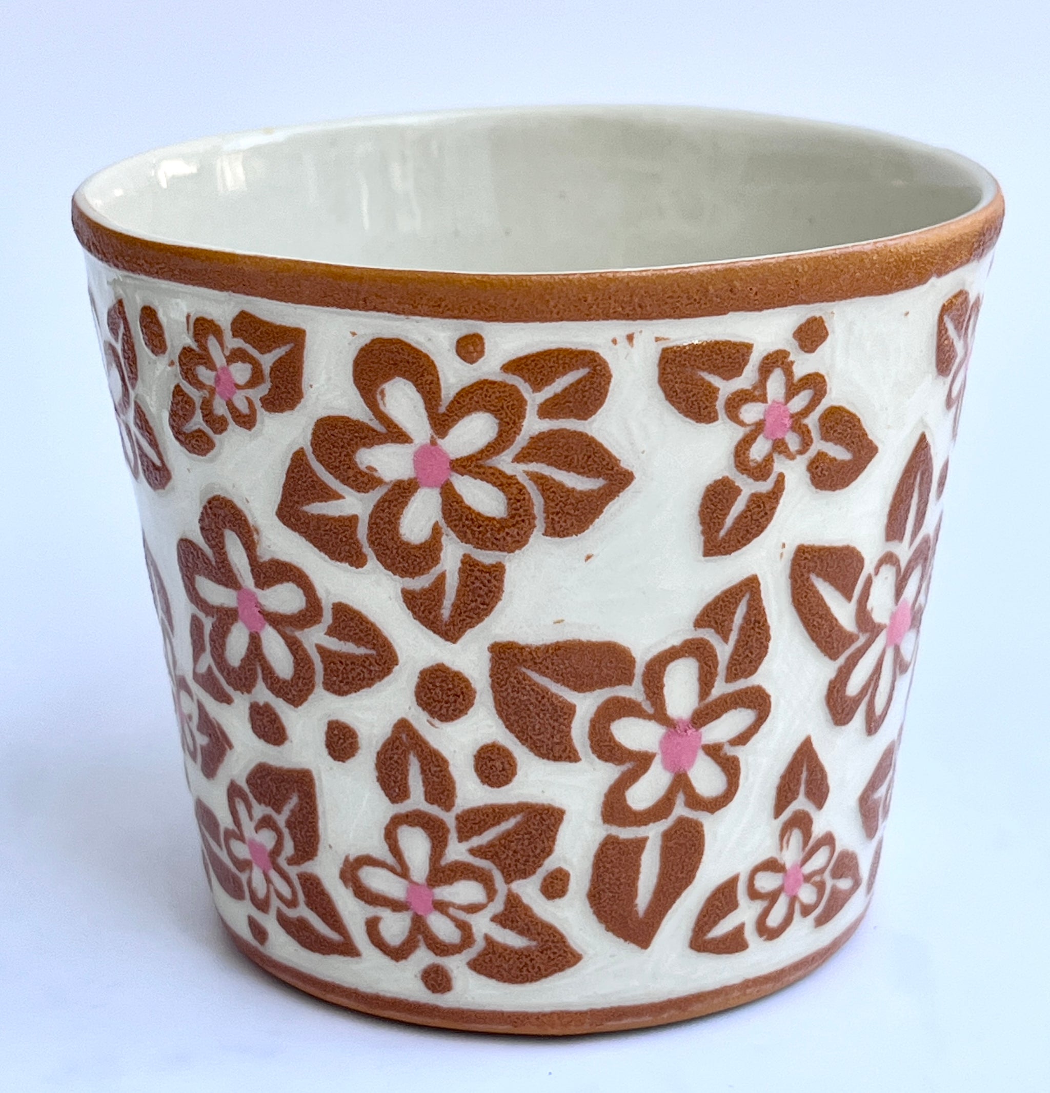 This little cup with an ochre floral motif with pink centers is perfect little cup for tea or even next to the bathroom sink!