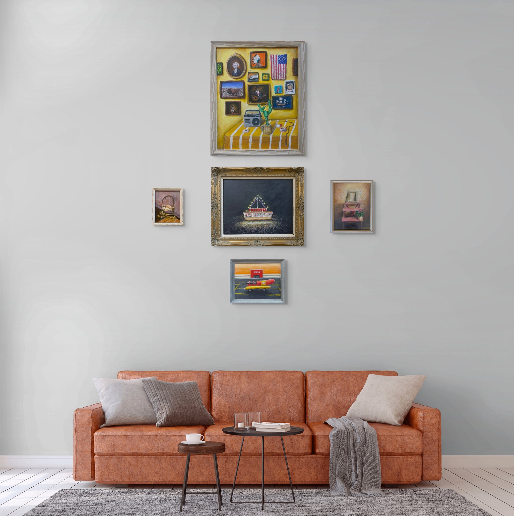 John Donofrio is a self-taught Austin artist whose work blends personal storytelling with Americana. He paints over discarded canvases from Austin Creative Reuse, often placing them in vintage frames to give new life to forgotten materials. Music deeply influences his process - he paints with songs playing and hopes some of that rhythm infuses into the work. John’s portfolio feels like a cross-country road trip: traveling back roads with no plan, good songs on the radio, and landscapes - both on the tables of folks visited along the way and scenes observed out his car window.