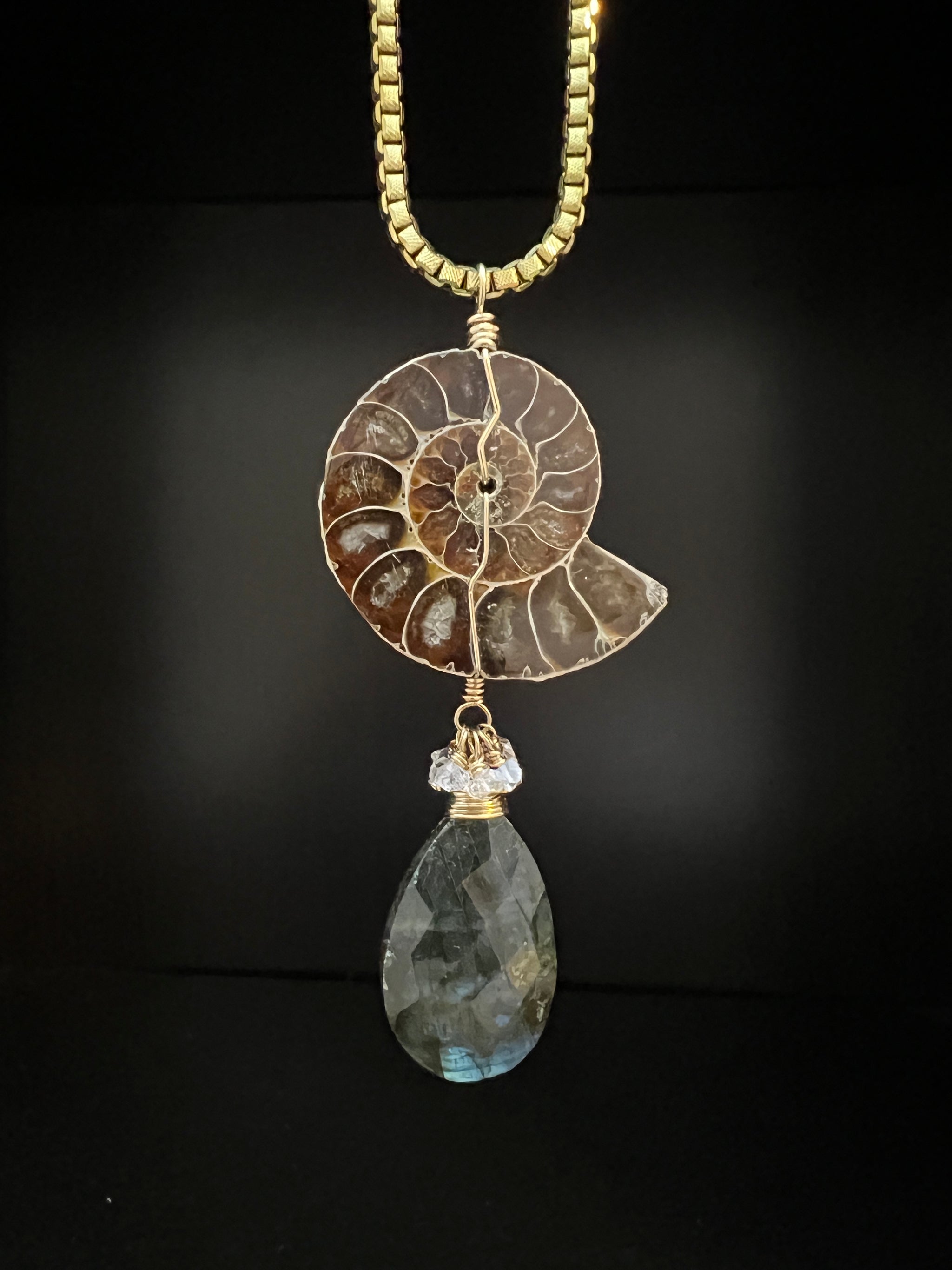 A sliced fossilized ammonite paired with a large labradorite drop and a cluster of tiny Herkimer Diamonds all hanging on an 18" long vintage Coco Chanel brass box chain.