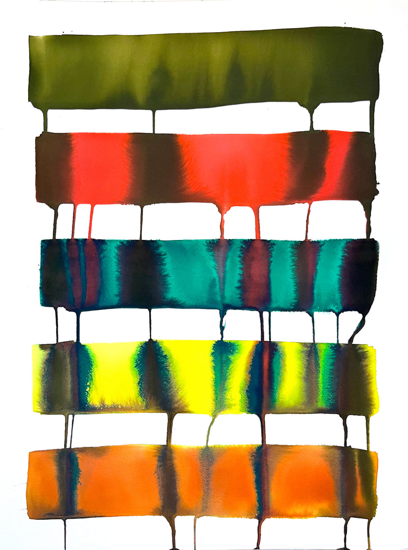 This collection was inspired by my own efforts to have my actions, words and experiences more aligned with my authentic self. The compositions feature color bars symbolizing step by step, action by action, coming into alignment, while the pigments blur, react and drip, alluding to the messiness of life and self progression. Each original artwork comes with a handwritten inspirational poem: