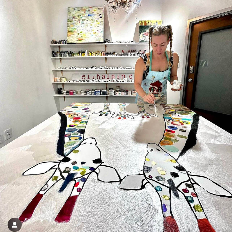 Eli Halpin grew up in Alaska and now lives and paints full time in Austin Texas. Her focus is on animal face expressions while enjoying and celebrating their paws, cheeks, whiskers, claws, hooves, antlers, horns and tusks. Eli uses thick oil paint and she loves to add acrylic, paper, metal leaf, spray paint, fabric, lace, ribbons, gemstones, sparkles, shells, crushed glass, beads, sand, mica, and pearls.Eli paints on wooden painting surfaces made with maple, birch and masonite in addition to hand crafted stretched canvases.