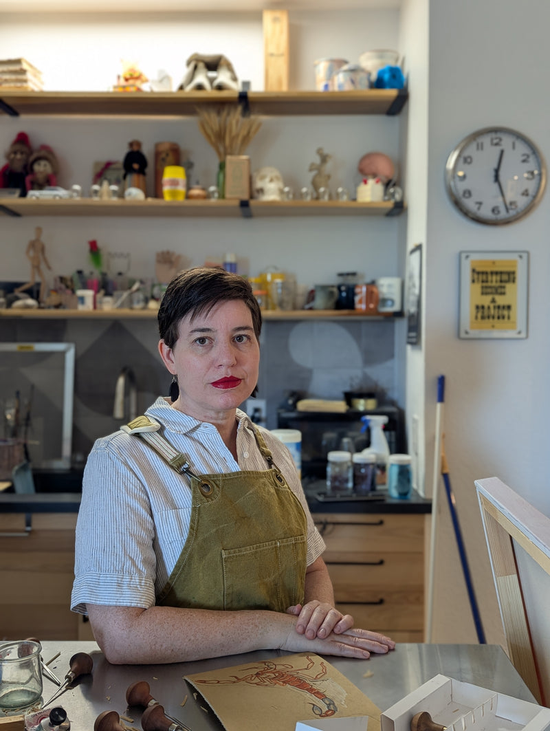 Leslie Deil is an artist that works mostly in relief printmaking and painting. She spent her early years on the West Coast and Midwest. Leslie went to Ripon College, earning Bachelor’s Degrees in Studio Art and English. She went on to get her Masters of Science in Information Science from UT Austin. After college, Leslie spent time in New York, Georgia, and Central Texas before settling in San Antonio. There is often a narrative behind her pieces, and she challenges you to contemplate the message. Recurring themes in her work are capturing moments, making allusions to literature and history, as well as wit and sense of irony. Her works have shown in galleries in Wisconsin, New York, Texas, and Australia.