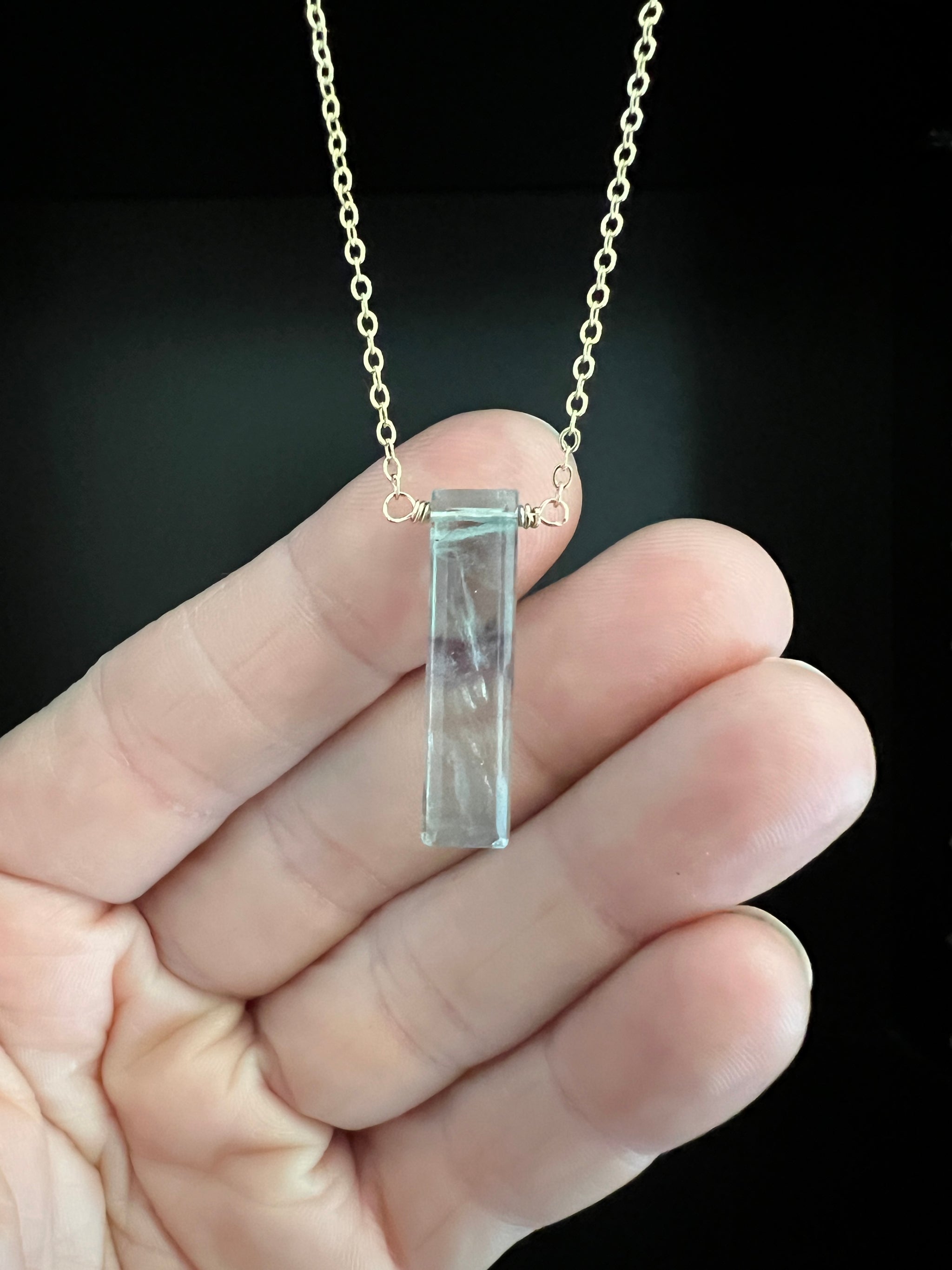 A pale Fluorite bar with gold filled wire work hanging on 18” long dainty brass chain with a gold filled spring ring clasp.