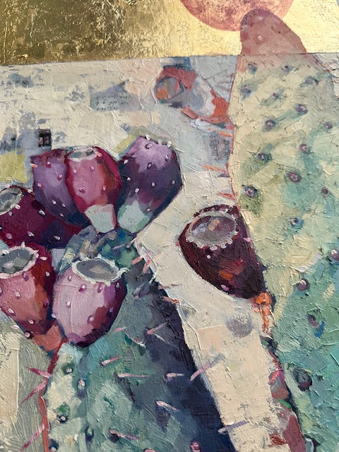 The cactus fruit or ‘tunas’ grow right on top of the pad’s edge of the Prickly Pear cactus. Cacti have no leaves but instead stems or pads. This fruit is the product of the plant’s growth cycle involving many biological and symbolic edges: An ending stage is the beginning of a new one, being the flowers that first appeared around the edges of the pad, the same spots from which the fruit emerges after pollination. Furthermore, these feed and make life sustainable to the many animal species thriving in the same habitat.