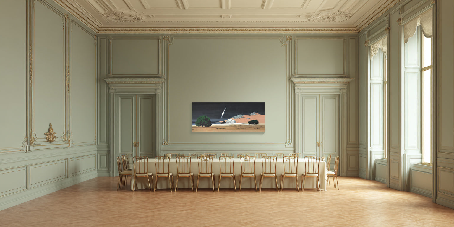 His paintings often feature animals and explore their relationship to the world around them. Avi’s work delves into the interaction between nature and human-made environments, highlighting the delicate balance between the two. Through his art, he captures both the precision of architectural forms and the organic, sometimes unpredictable qualities of the natural world, with animals frequently taking central roles in these dynamic interactions.